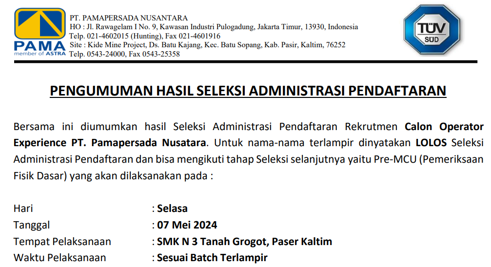 Pengumuman Hasil Seleksi Administrasi Calon Operator Experience PT. Pamapersada Nusatara