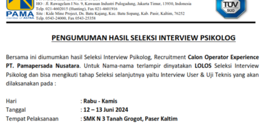 Sehubungan dengan Kerjasama PT. Pamapersada Nusantara dengan BKK SMK Negeri 3 Tanah Grogot terkait Penerimaan Karyawan pada perusahaan tersebut, berikut kami lampirkan daftar nama yang dinyatakan LOLOS seleksi Pemeriksaan Fisik Dasar (Pre-MCU) untuk posisi operator experience dan berhak melanjutkan ke tahap tes selanjutnya (seleksi psikotest). Mohon kepada seluruh peserta yang dinyatakan lolos untuk memperhatikan jadwal tes dan persyaratan yang harus dipenuhi pada saat pelaksanaan test.