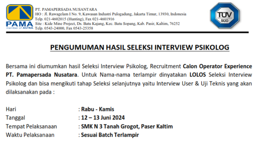 Pengumuman Hasil Interview Psikolog PT. Pamapersada Nusantara 2024